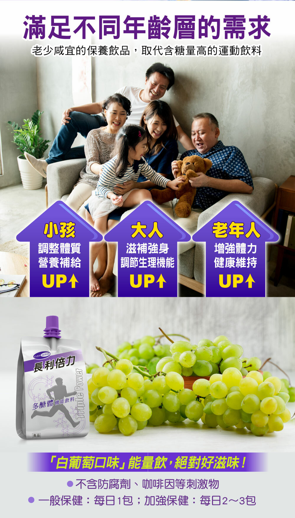 ☆首創孩童、青少年及成人皆喜愛的「白葡萄口味」能量飲,絕對好滋味!