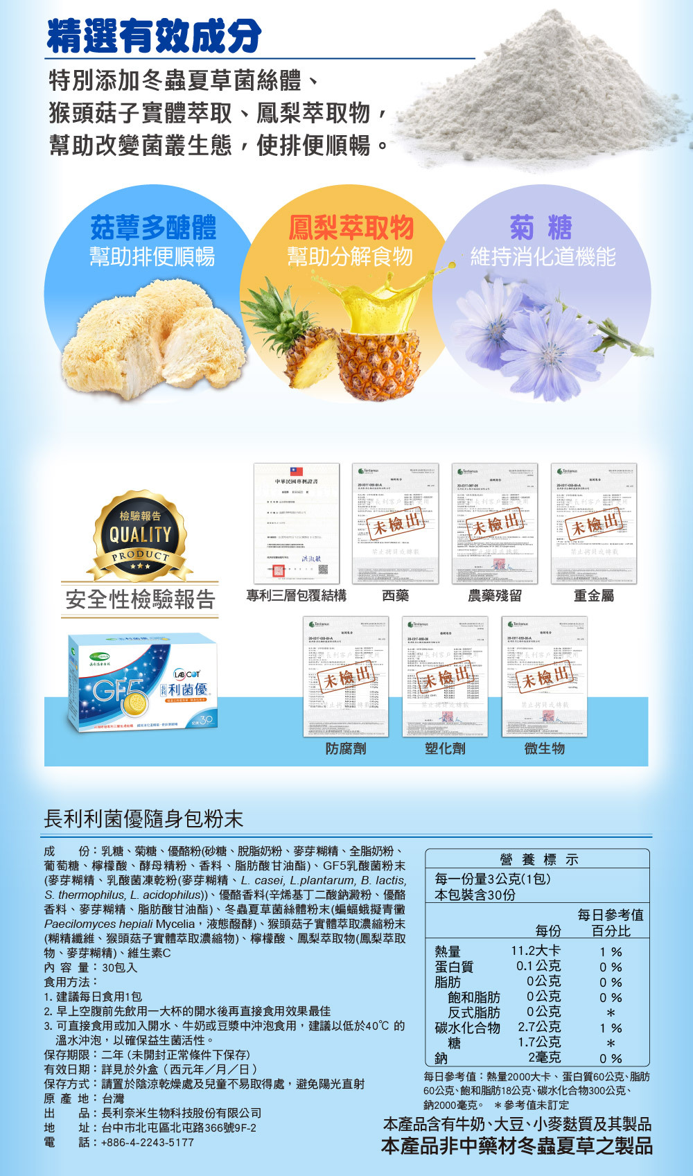 成 份:乳糖、菊糖、優酪粉(砂糖、脫脂奶粉、麥芽糊精、全脂奶粉、葡萄糖、檸檬酸、酵母精粉、香料、脂肪酸甘油酯)、GF5乳酸菌粉末(麥芽糊