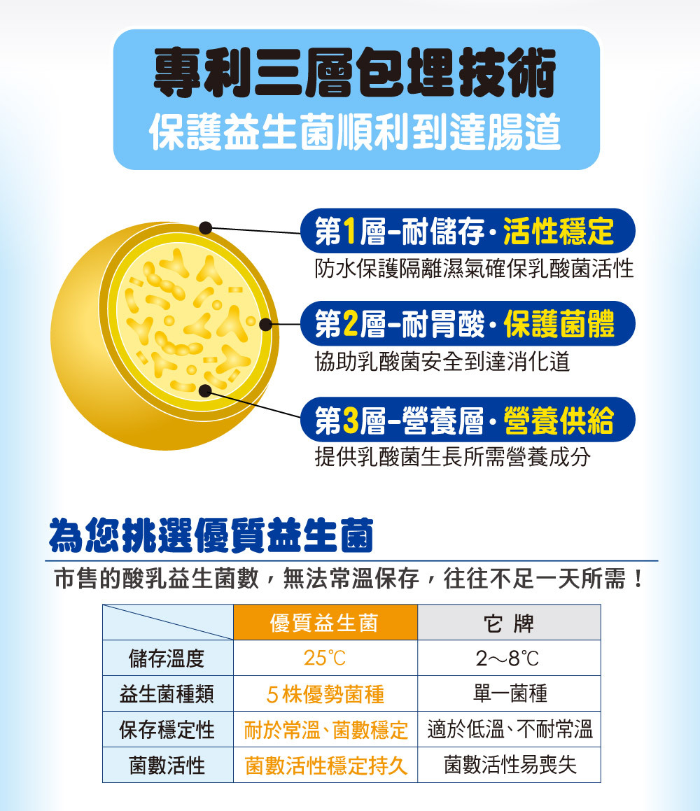 ◆ 專利三層包埋技術,使乳酸菌順利 通過胃酸及膽鹽的考驗