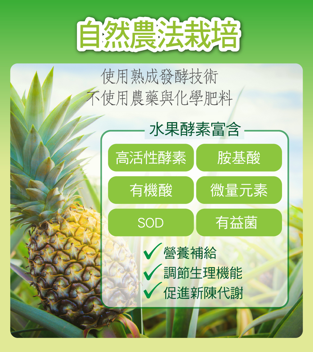 ☆使用自然農法栽培,不使用農藥和化學肥料之鳳梨、木瓜及20餘種水果,含豐富水果酵素、有機酸、胺基酸、微量元素及SOD等