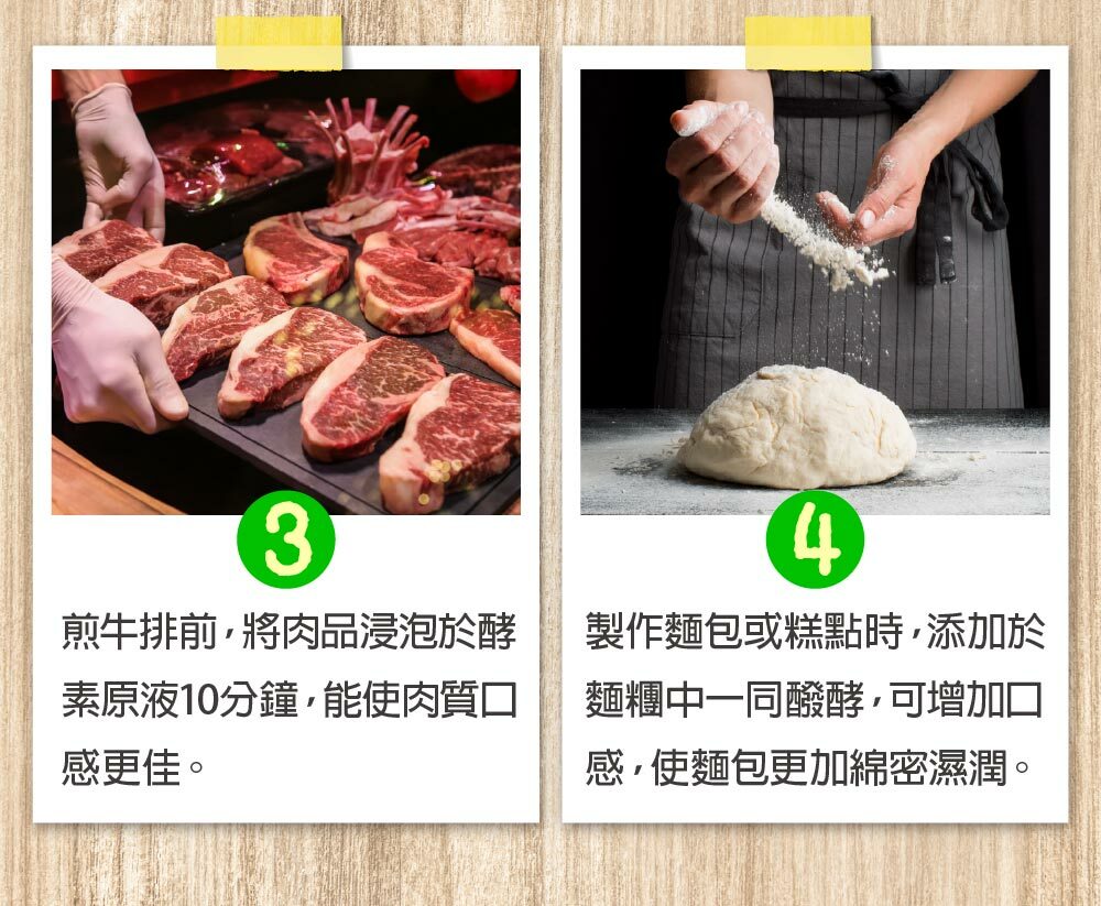 3、煎牛排前,將肉品浸泡於酵素原液10分鐘,能使肉質口感更佳