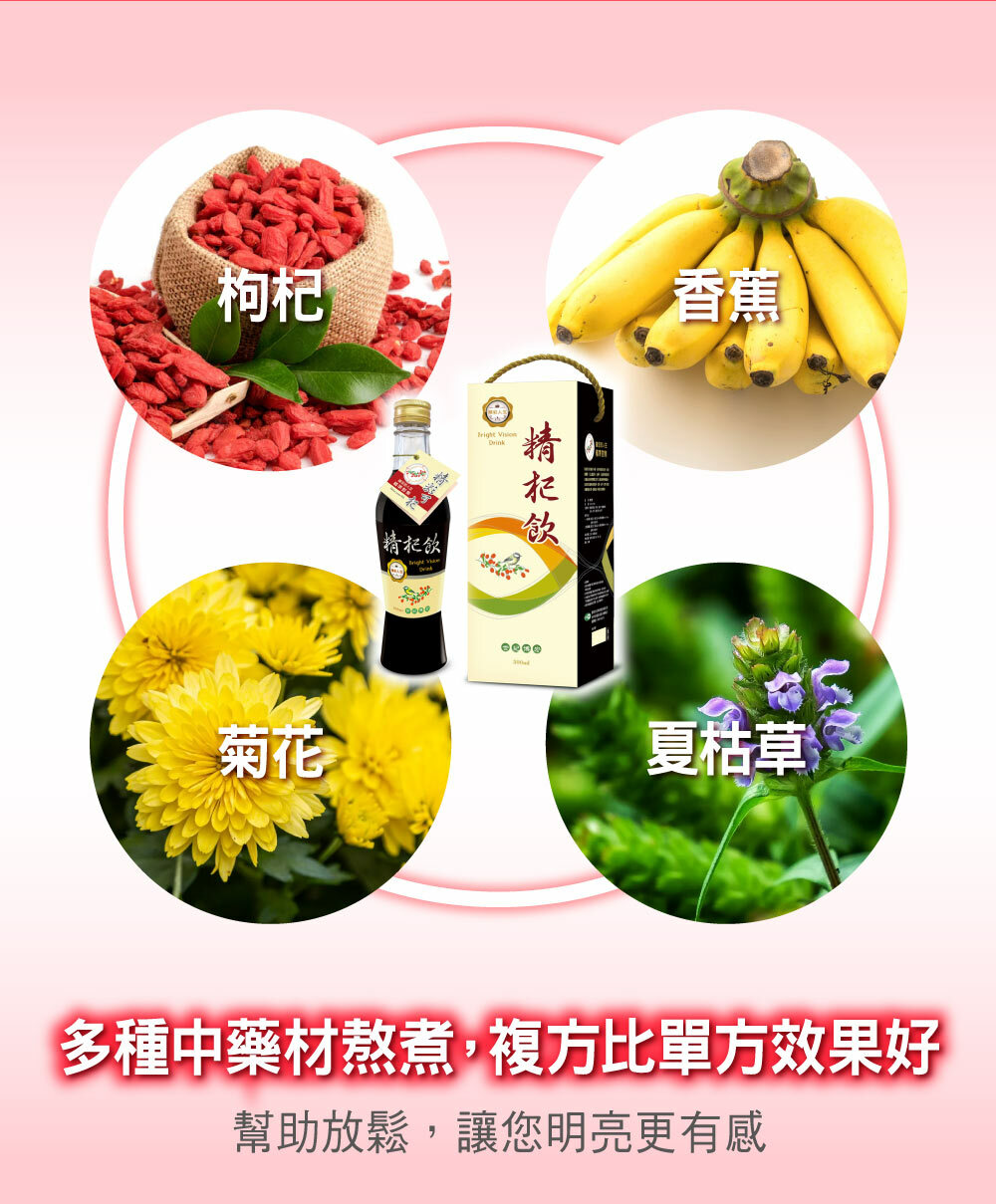 成 份:香蕉萃取液、枸杞、菊花、石決明、生地、白芍、夏枯草、女貞子、甘草、茯苓、白朮