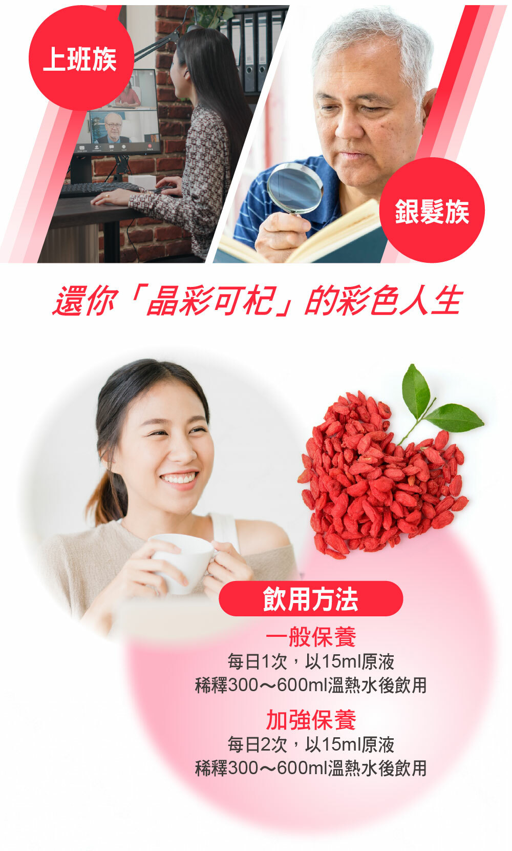 2、加強保養:每日2次,每次以15ml原液稀釋300~600ml溫熱水後飲用